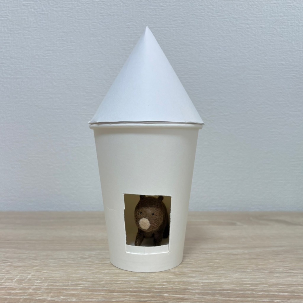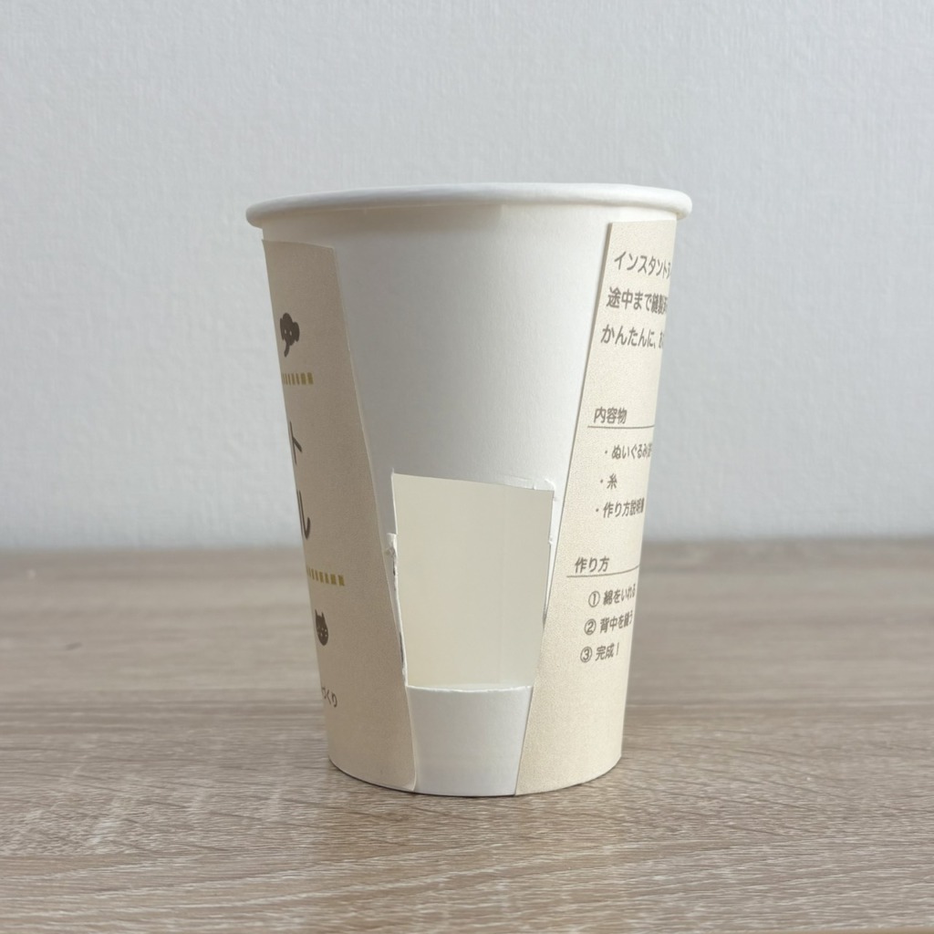 なるほど、まっすぐの紙を紙コップに貼り付けると歪んでしまうのだなぁ・・・という気づきを得ました。